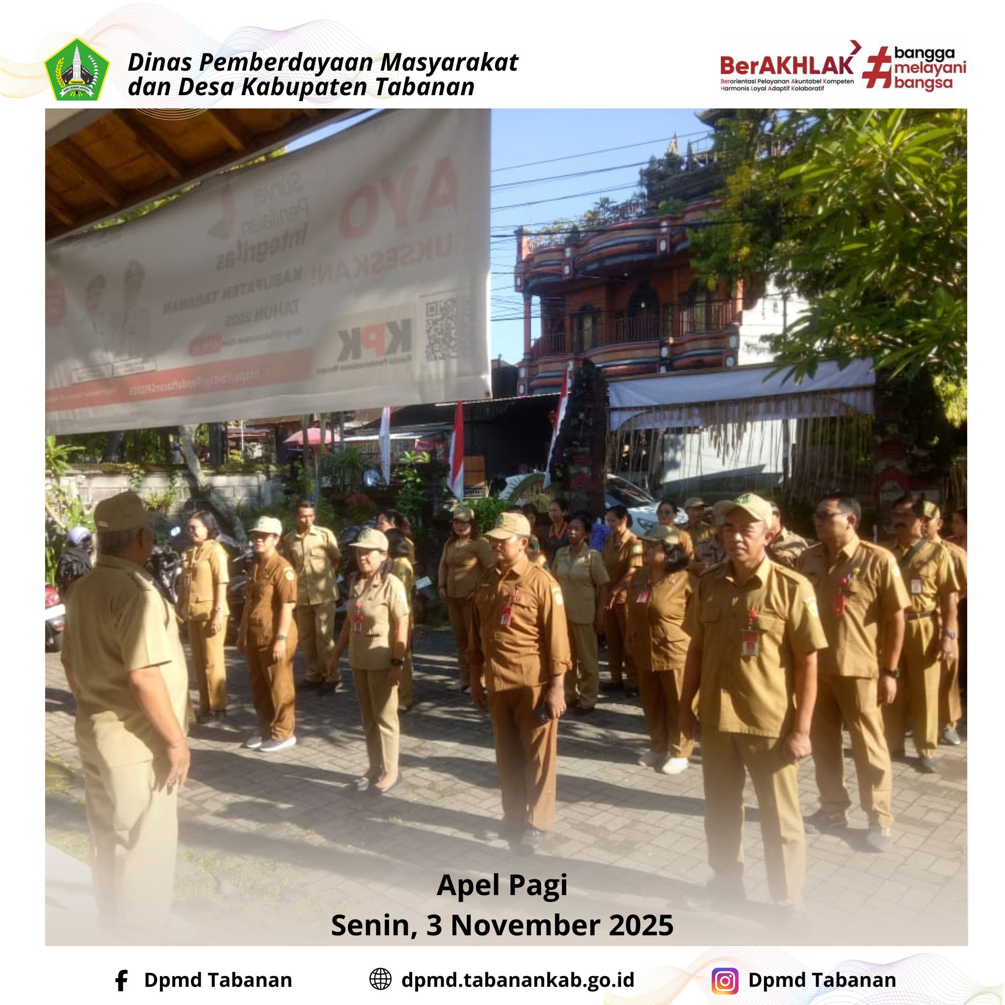 DPMD TABANAN – Senin, 3 November 2025 Navigasi pos Rapat Koordinasi bersama Ketua Forum Perbekel dalam rangka membahas percepatan implementasi Program Pendataan Desa Presisi, bertempat di ruang kerja DPMD Tabanan. Apel Pagi DPMD Tabanan