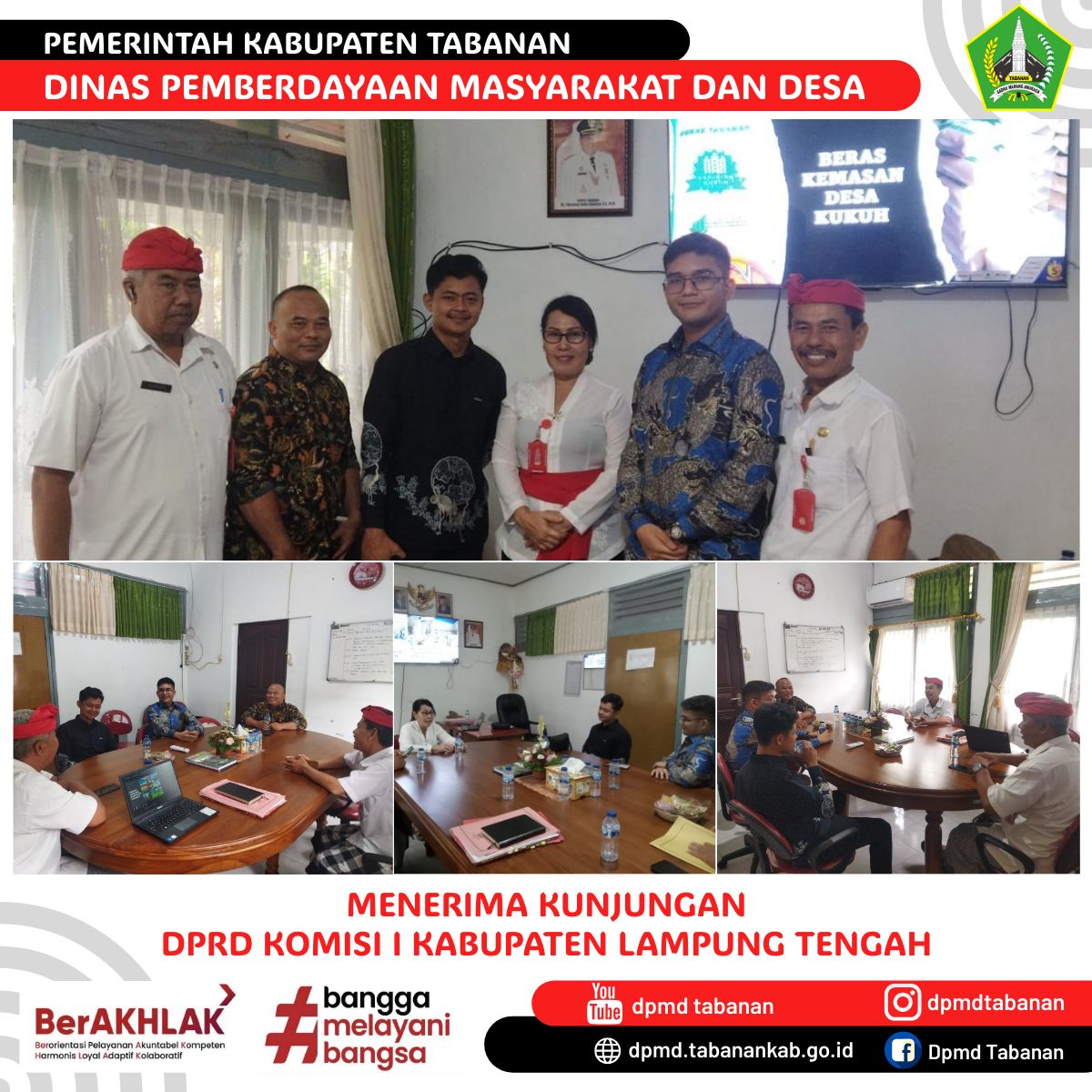 Menerima kunjungan dari Komisi I DPRD Kabupaten Lampung Tengah, Provinsi Lampung yang hadir sebanyak 3 orang yang diterima oleh Kepala Dinas PMD Tabanan, Dra. I Gusti Ayu Nyoman Supartiwi, M.Si