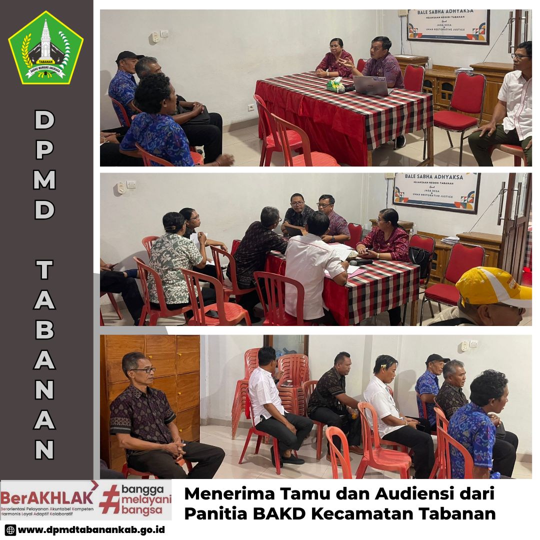 DPMD TABANAN – Rabu, 13 Agustus 2025 Monev pengelolaan keuangan desa di Desa Antap kecamatan Selemadeg, Kabupaten Tabanan Navigasi pos Menerima tamu dan Audiensi dari BAKD Kec Tabanan terkait Peningkatan Kapasitas BPD di Ruang Kerja Kepala DPMD Tabanan Rapat Persiapan Verifikasi Lanjutan Kabupaten Kota Sehat (KKS) di Kabupaten Tabanan yang dilaksanakan di ruang rapat rama bappeda Tabanan