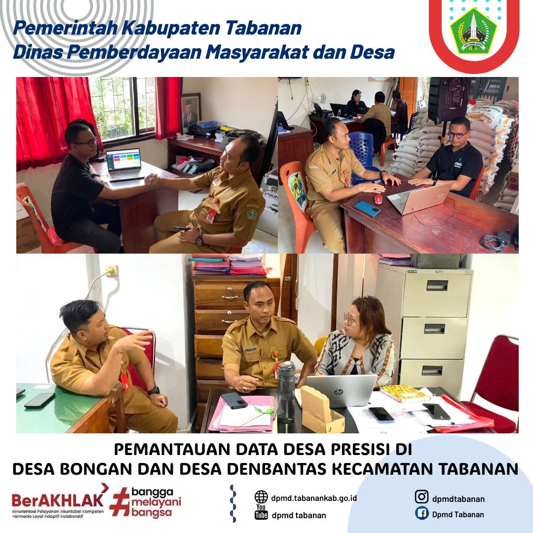DPMD TABANAN – Senin, 9 Desember 2024 Pemantauan Data Desa Presisi di Desa Bongan dan Desa Denbantas Kecamatan Tabanan. Navigasi pos Sosialisasi tata cara pelaksanaan pemilihan Perbekel Antar Waktu di Desa Peken Belayu Sosialisasi Penyusunan Peraturan Desa di Kecamatan Pupuan, Kabupaten Tabanan.