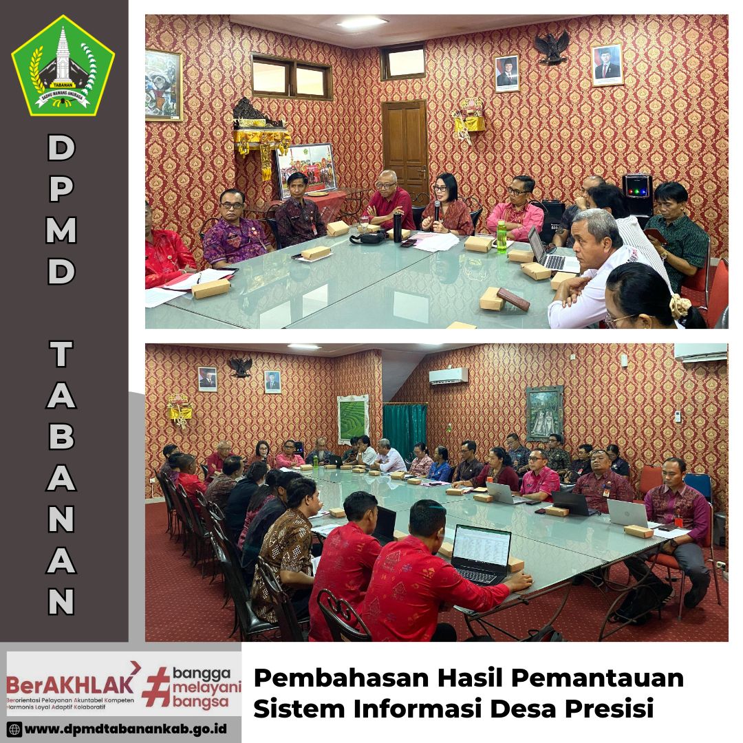 DPMD TABANAN – Selasa, 24 Juni 2025 Pembahasan Hasil Pemantauan Sistem Informasi Desa Presisi di ruang rapat VIP Lantai 2 Kantor Bupati Tabanan Navigasi pos Persiapan Studi EHRA( Enviromental Health Risk Assesment) yang dilaksanakan di ruang Rama Bappeda Kabupaten Tabanan Monev Penyelenggaraan Muyawarah Desa di Desa Bengkel Sari, Kecamatan Selemadeg Barat, Tabanan