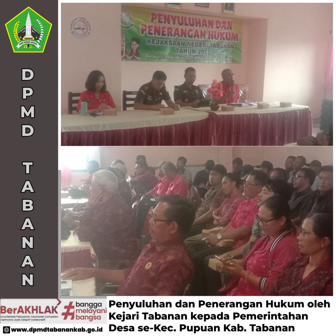 DPMD TABANAN – Selasa, 19 Agustus 2025 Penyuluhan dan penerangan hukum oleh Kejaksaan Negeri Tabanan kepada Pemerintahan Desa se-Kec. Pupuan bertempat di Kantor Camat Pupuan, Tabanan Navigasi pos Pelatihan pengelolaan klasifikasi berkembang di Rumah Makan Nami Rasa, Penebel, Tabanan Sosialisasi Pola Kerjasama Perumda Dharma Shantika Tababan dengan BUMDesa SE Kec. Selemadeg Barat, Kabupaten Tabanan.
