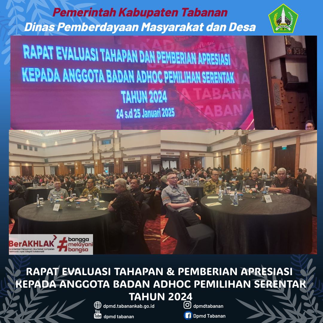 DPMD TABANAN – Jumat, 24 Januari 2025 Rapat evaluasi tahapan dan pemberian apresiasi kepada anggota badan adhoc pemilihan serentak tahun 2024 di discovery Kartika plaza hotel Kuta selatan, Badung Navigasi pos Sosialisasi Lanjutan Tata Cara Penggunaan Aplikasi e-SKM Kabupaten Tabanan di ruang rapat jayaning singasana, Tabanan Peningkatan Kapasitas Perangkat Desa dan BPD Terkait Pelaksanaan Kegiatan Desa
