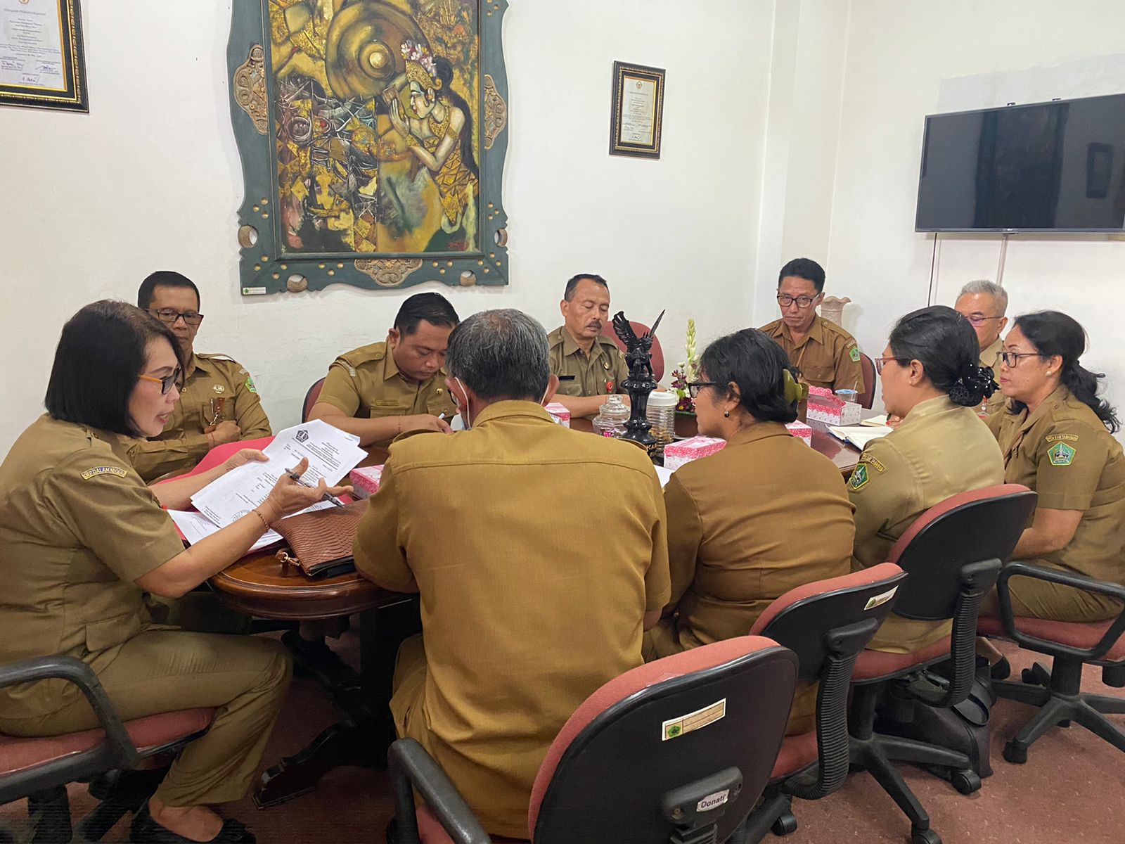 Kepala Dinas Pemberdayaan Masyarakat dan Desa melaksanakan kegiatan rapat koordinasi membahas kesiapan hari pemungutan suara dan pelaksanaan pemantauan pilkel di ruang asisten I