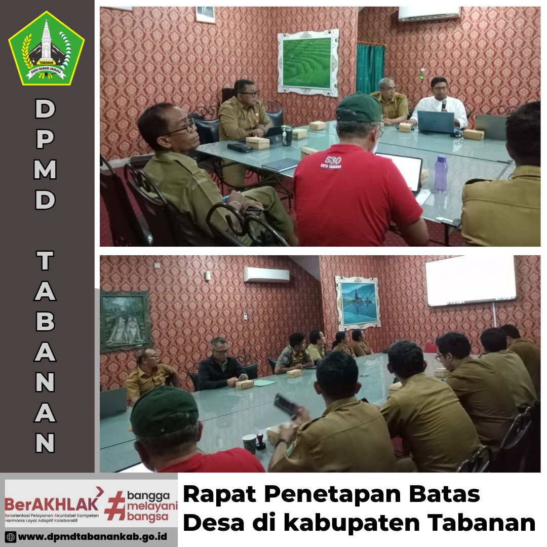 DPMD TABANAN – Senin, 25 Agustus 2025 Rapat penetapan batas desa di kabupaten Tabanan di R.R VIP Lt.2 Kantor Bupati Tabanan yang dipimpin langsung oleh Asistem Pemerintahan dan Kesejahteraan Rakyat Navigasi pos Fasilitasi pembinaan dan penguatan kelembagaan dilingkungan BAWASLU Kab Tabanan di Homm Saranam, Meraksari, Baturiti, Tabanan. Monev Pengelolaan Keuangan Desa di Desa Batuaji Kecamatan Kerambitan, Kab. Tabanan