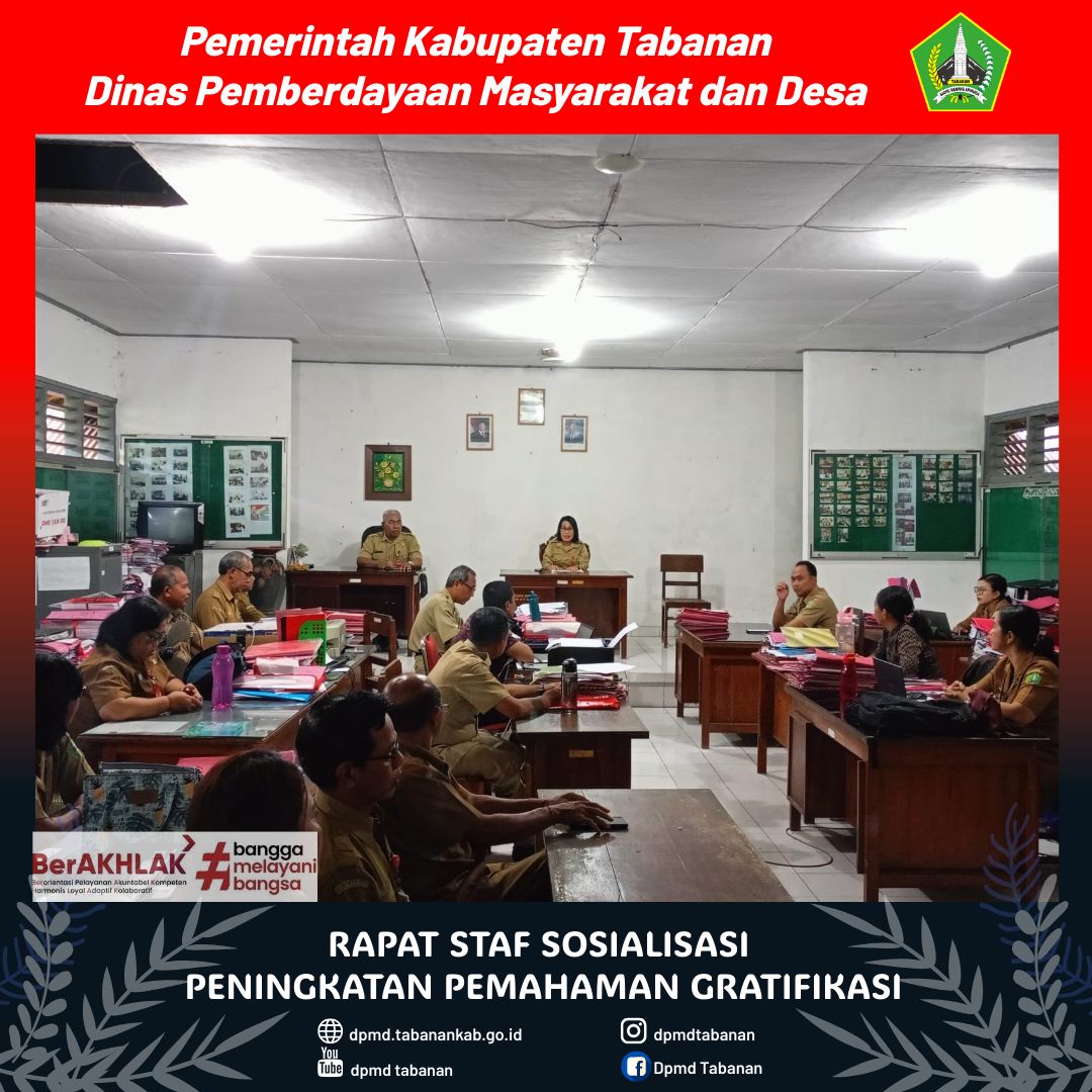 Rapat staf sosialisasi peningkatan pemahaman gratifikasi dilaksanakan di Kantor DPMD Tabanan dan diikuti oleh seluruh pegawai DPMD Tabanan