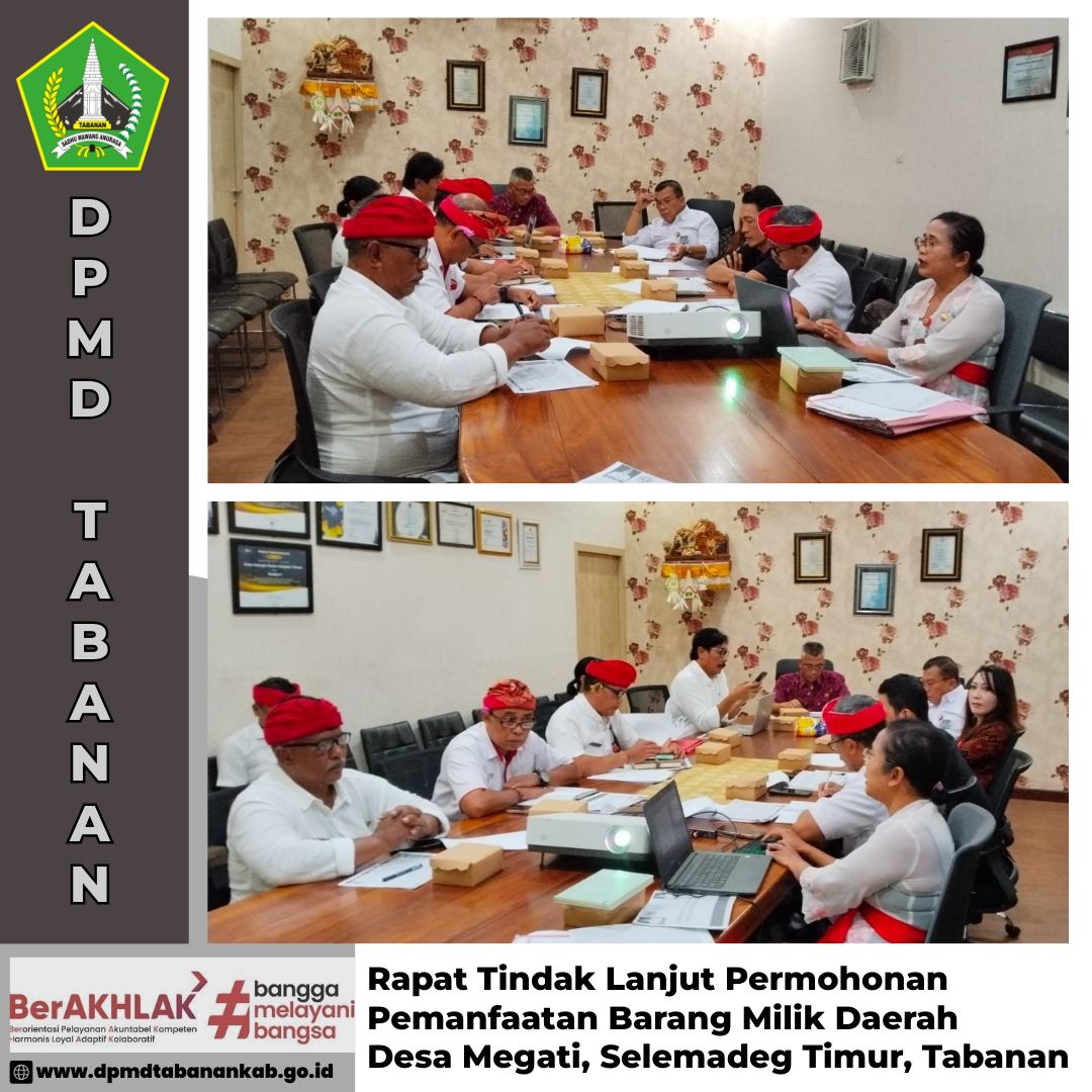DPMD TABANAN – Rabu, 25 Juni 2025 Rapat tentang tindak lanjut permohonan pemanfaatan Barang Milik Desa (BMD) dari Desa Megati, Kec. Selemadeg Timur, Kabupaten Tabanan. Navigasi pos Monitoring Evaluasi Penyelenggaraan Musyawarah Desa (Musdesus) Desa Bajera, Kec. Selemadeg, Kabupaten Tabanan Peningkatan Kapasitas Badan Permusyawaratan Desa (BPD) se-Kec. Selemadeg, Selemadeg Barat, Selemadeg Timur dan Pupuan