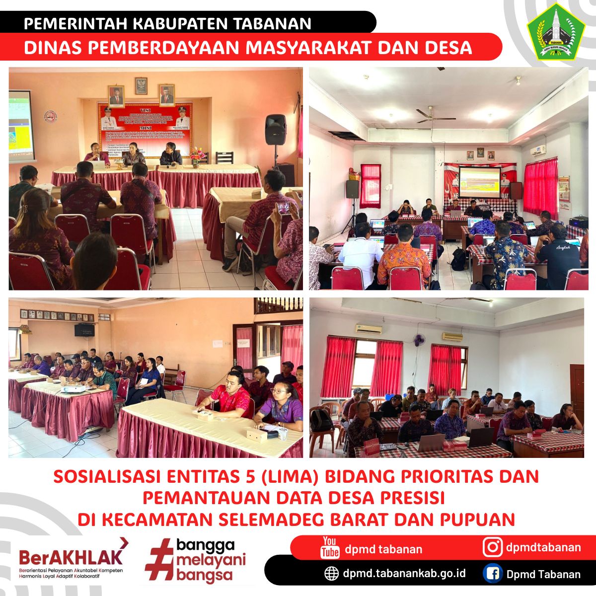 Sosialisasi Entitas 5 (lima) Bidang Prioritas dan Pemantauan Data Desa Presisi di Kecamatan Selemadeg Barat dan Pupuan. DPMD TABANAN – Selasa, 29 Oktober 2024 Navigasi pos Bimtek peningkatan kapasitas perangkat desa dan anggota BPD yang dilaksanakan di Desa Jatiluwih, Penebel, Tabanan Rapat Forum Komunikasi Publik (FKP) DPMD Tabanan