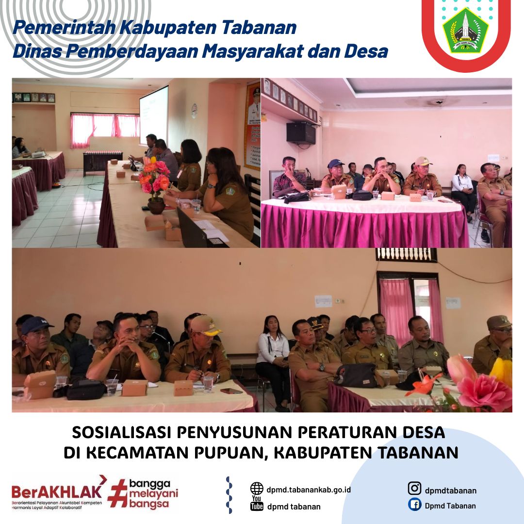 DPMD TABANAN – Senin, 9 Desember 2024 Sosialisasi Penyusunan Peraturan Desa di Kecamatan Pupuan, Kabupaten Tabanan. Navigasi pos Pemantauan Data Desa Presisi di Desa Bongan dan Desa Denbantas Kecamatan Tabanan. Pemantauan Pos Layanan Hukum Ham Desa (Posyankumhamdes) Desa Gubug dari kepala Badan Pembina Hukum Nasional kementerian Hukum RI