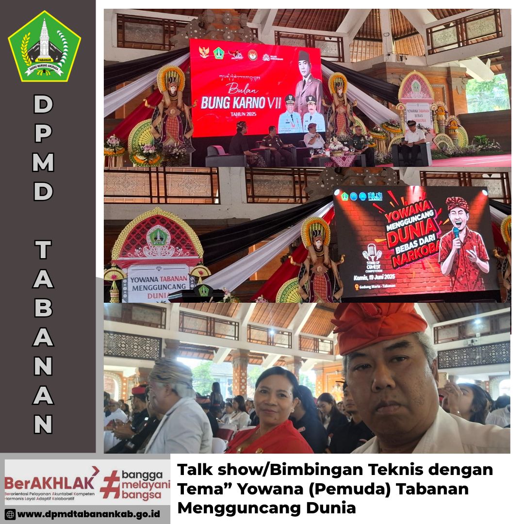 DPMD TABANAN – Kamis, 19 Juni 2025 Talk show/Bimbingan Teknis dengan Tema” Yowana (Pemuda) Tabanan Mengguncang Dunia di Gedung Kesenian I Ketut Marya Navigasi pos Rapat Pembahasan Laporan Pendahuluan Penyusunan Kajian Pelaksanaan Bungan Desa Kabupaten Tabanan Proses Penilaian Lomba memasak dalam rangka “Bulan Bung Karno” Tahun 2025, Kabupaten Tabanan