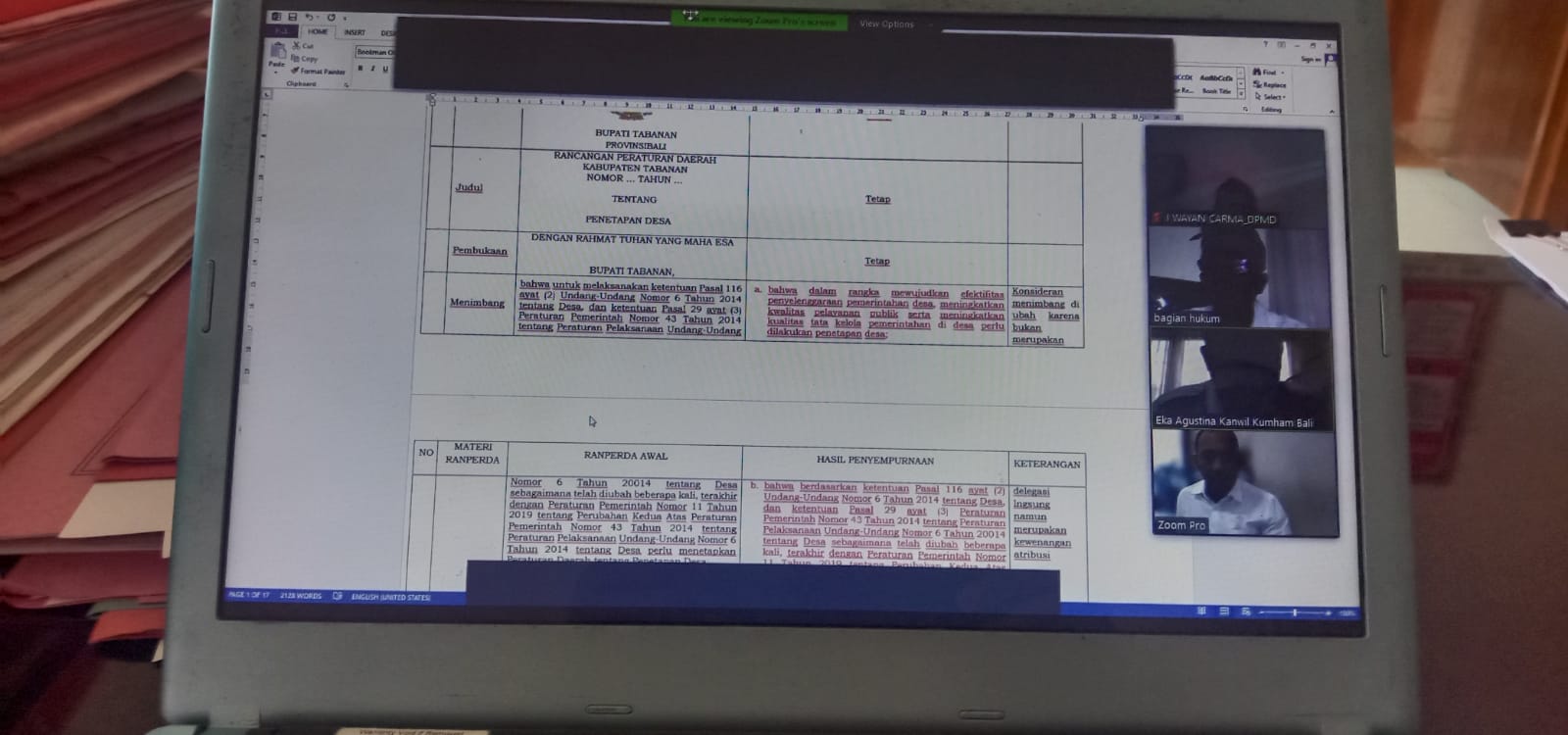 Dinas Pemberdayaan masyarakat dan Desa dalam hal ini diwakili oleh bidang Pemerintahan Desa melaksanakan kegiatan Zoom meting tentang Harmonisasi Produk Hukum Ranperda penetapan desa dengan Kawil KUMHAM Provinsi Bali bersama Setda kabupaten Tabanan